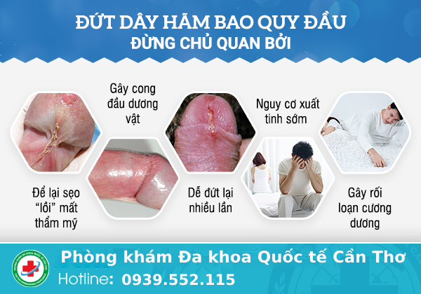 Khi đứt dây hãm nếu không được xử lý đúng cách, không vệ sinh tốt thì có khả năng dẫn đến viêm nhiễm tại dây hãm, tiếp đó lan sang bao quy đầu, quy đầu và nhiều bệnh lý nam khoa phức tạp khác.